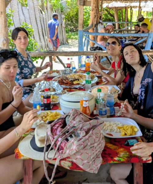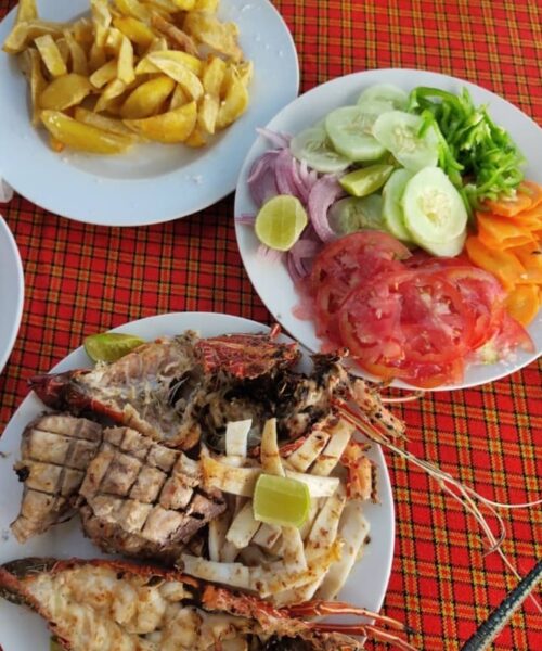 Lunch is served on the island, featuring a freshly prepared traditional Zanzibar meal, including Zanzibar rice and a selection of seafood.